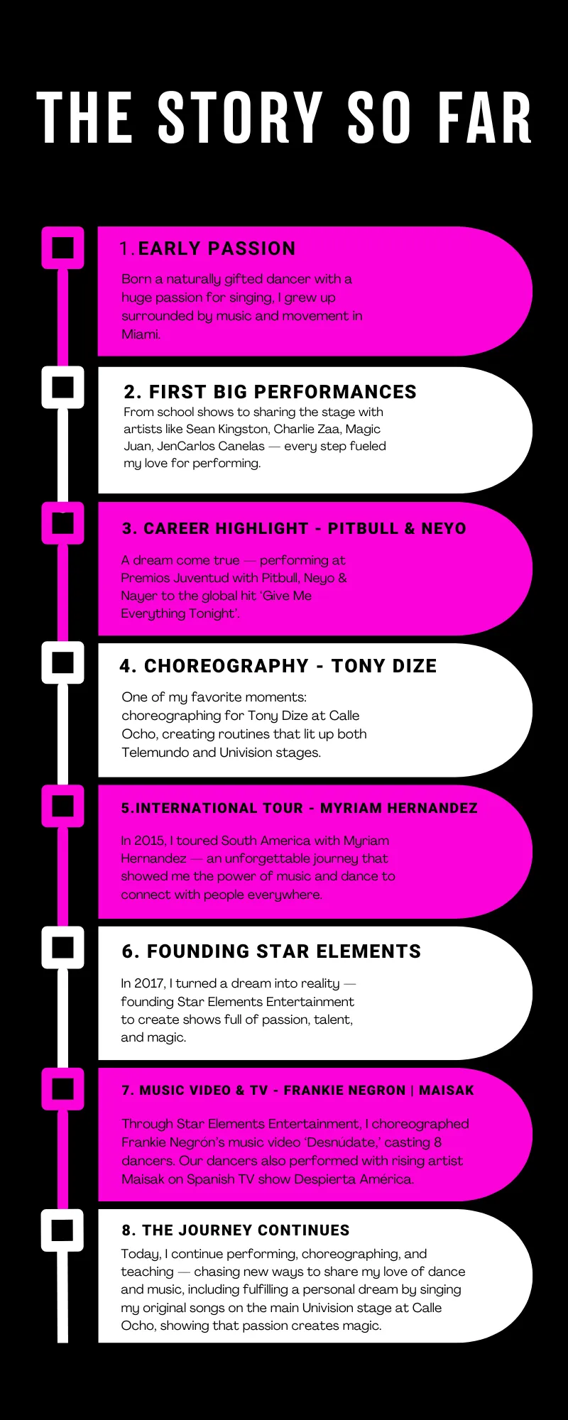 For over 20 years, Jessica has worked as a dancer, choreographer, and instructor in South Florida’s vibrant entertainment scene. She’s performed alongside artists like Sean Kingston, Charlie Zaa, Los Illegales, Magic Juan, Jencarlos Canela, Tony Dize, Nicky Jam, and Gente de Zona, and her career highlights include performing at Premios Juventud with Pitbull and Neyo, and touring South America with Myriam Hernandez.